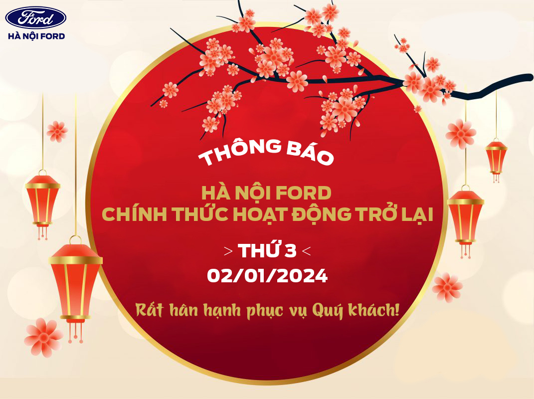 Chào mừng bạn đến với Hà Nội Ford trong năm mới 2024! Sau kỳ nghỉ Tết Dương lịch đầy hứng khởi, chúng tôi rất vui mừng thông báo rằng từ ngày 02/01/2024, Hà Nội Ford đã sẵn sàng trở lại và đồng hành cùng bạn trên mọi hành trình mới.