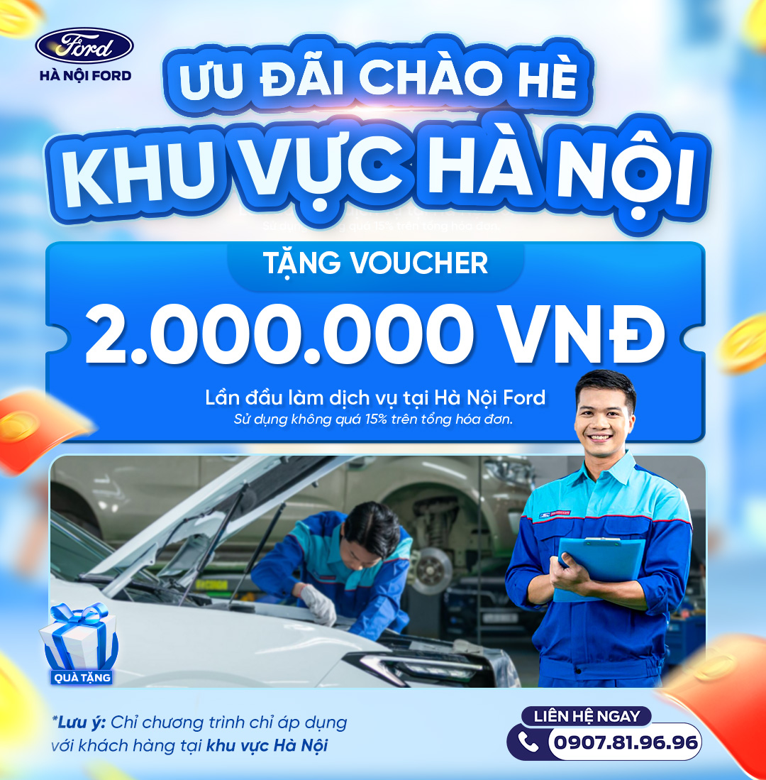 Mùa hè rực rỡ đã đến! Nếu bạn đang tìm kiếm dịch vụ bảo dưỡng và sửa chữa xe Ford chuyên nghiệp, hãy đến với Hà Nội Ford để nhận ngay Voucher 2.000.000 VNĐ khi lần đầu tiên sử dụng dịch vụ. Đây là cơ hội tuyệt vời để chăm sóc xế yêu của bạn với chi phí ưu đãi.