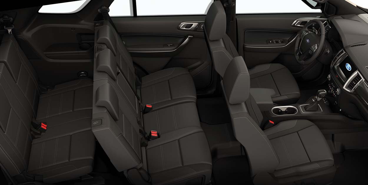 Ford Everest được trang bị điều hòa tự động 2 vùng với các cửa gió riêng biệt cho cả 3 hàng ghế. Hàng ghế đầu chỉnh điện, Hàng ghế thứ 2 có thể ngả lưng hoặc trượt lên để nới rộng không gian cho hàng ghế thứ 3, hàng ghế thứ 3 gập điện, có thể gập phẳng tạo thành mặt phẳng giúp khoang chừa hàng rộng hơn. Phiên bản cao cấp nhất Titanium 4WD còn có cửa sổ trời toàn cảnh mang lại không gian thoáng đãng hơn.