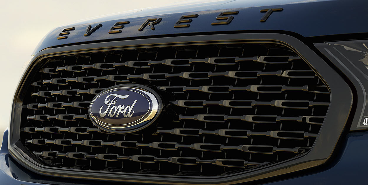 Đầu xe Ford Everest 2021 tách biệt hai phần rõ rệt. Phần trên nổi bật với bộ lưới tản nhiệt hình đa giác mở rộng. Các thanh ngang to dày quen thuộc ở bản tiền nhiệm nay đã được thay thế bằng lưới tổ ong 3D theo xu hướng mới.