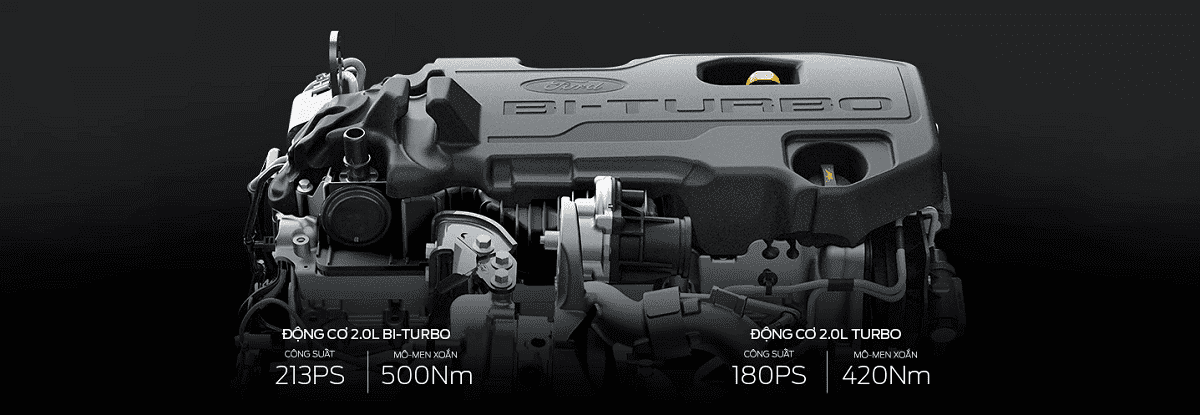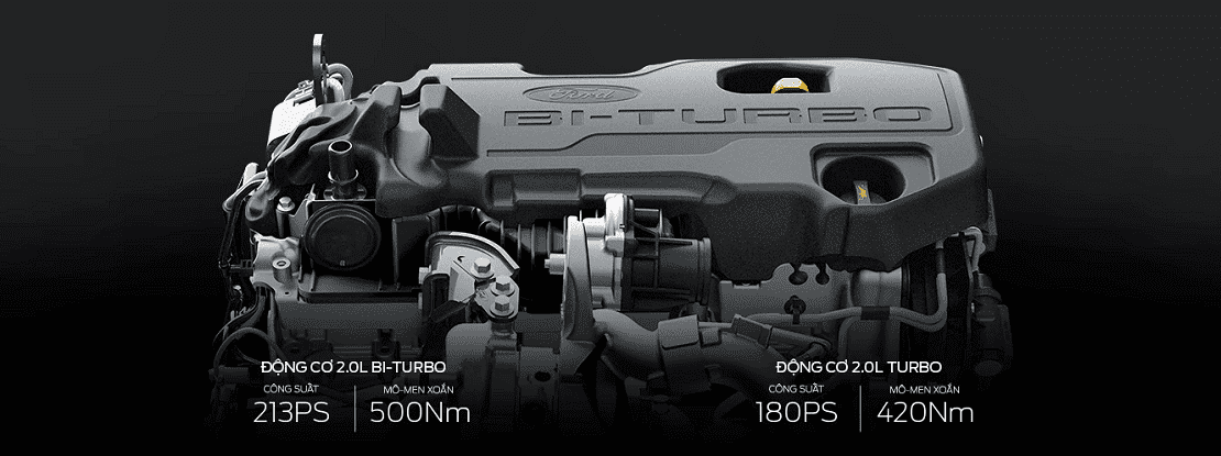 Động cơ diesel Bi-Turbo 2.0L của chúng tôi là một thiên tài. Bạn có thể tìm thấy công nghệ diesel tiên tiến này trong các dòng xe Ford Ranger Bi-Turbo và Ford Everest Bi-Turbo. Hai động cơ tăng áp hoạt động độc lập ở các tốc độ khác nhau để cung cấp thêm mô-men xoắn theo nhu cầu lái, cùng với hiệu quả nhiên liệu tốt nhất từng thấy. Động cơ này được lắp sẵn trong xe: