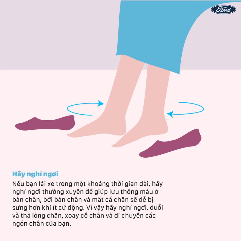 “Bộ não khi mang thai” chịu đựng nhiều căng thẳng hơn bình thường, vì vậy hãy lên kế hoạch trước cho các chuyến đi của bạn. Nếu có thể, hãy tránh lái xe đường dài và nghỉ ngơi thường xuyên để giúp lưu thông máu ở bàn chân, bởi bàn chân và mắt cá chân sẽ dễ bị sưng hơn khi ngồi trong một thời gian dài. Vì vậy, hãy nghỉ ngơi, duỗi chân và di chuyển chân, bàn chân và các ngón chân của bạn.