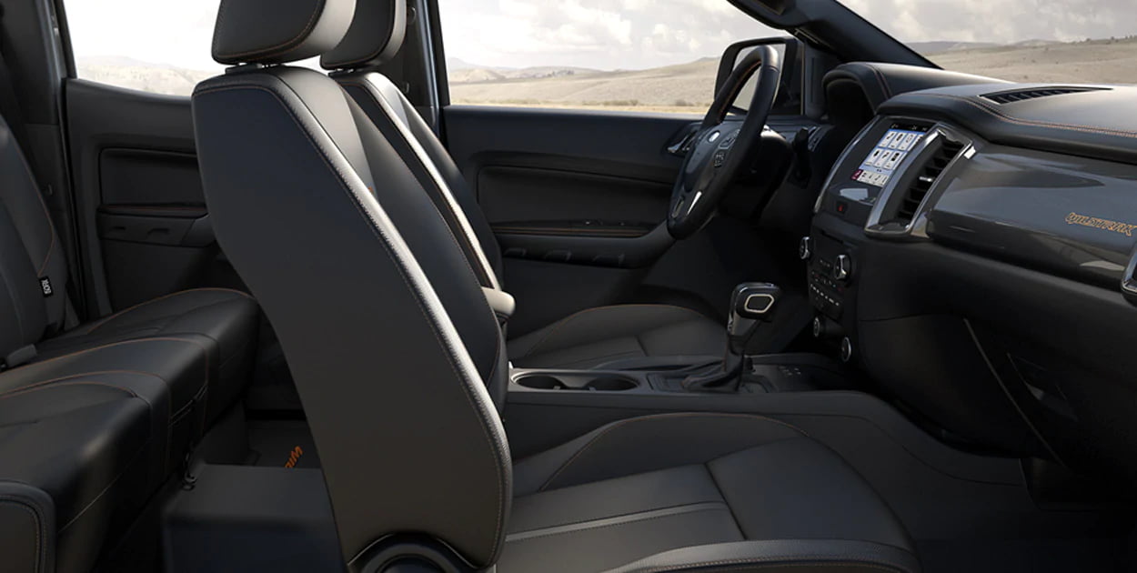 Trong khoang cabin, Ranger Wildtrak có được nội thất bọc da, trang trí bằng các điểm nhấn màu vàng. Ghế lái chỉnh điện 8 hướng, ghế phụ chỉnh điện 4 hướng. Hệ thống điều hòa tự động 2 vùng. Các tiện nghi tiêu chuẩn của xe gồm hệ thống thông tin giải trí với màn hình cảm ứng 8 inch, 2 màn hình 4,2 inch trong bảng đồng hồ, ổ điện AC 230V, khoá thông minh không chìa, hộp đồ trung tâm có làm mát, dàn âm thanh 6 loa,..