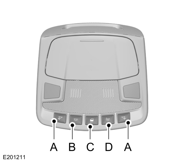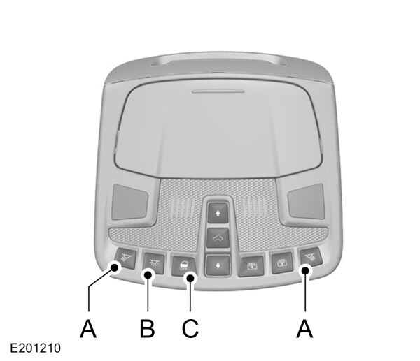 Các điều khiển cửa kính nóc nằm trong bảng điều khiển trên trần xe và có tính năng mở và đóng bằng một lần nhấn công tắc. Để dừng điều khiển khi chức năng mở và đóng bằng một lần nhấn công tắc đang hoạt động, hãy nhấn vào nút điều khiển thêm một lần nữa.