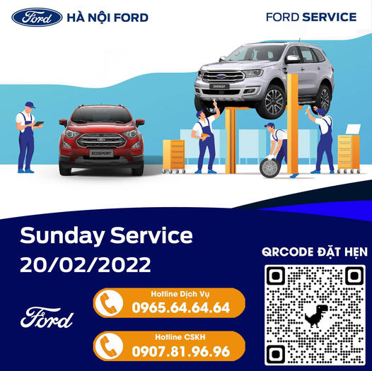 Nhằm đáp ứng nhu cầu bảo dưỡng và sửa chữa xe những ngày đầu năm mới để phục vụ những chuyến đi xa, Hà Nội Ford tăng cường phục vụ Quý khách hàng qua chương trình SUNDAY SERVICE - DỊCH VỤ NGÀY CHỦ NHẬT vào ngày 20/02/2022