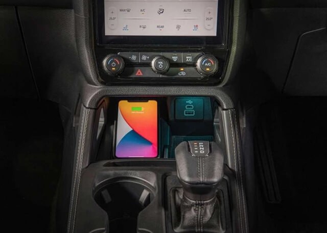 Khu vực trung tâm điều khiển xuất hiện sạc điện thoại không dây, cần gạt số bọc da và phanh tay điện tử.