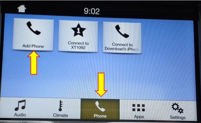 Thao tác: Bật Bluetooth trên điện thoại sang ON, trên màn hình cảm ứng của xe chọn Phone > Add phone, trên điện thoại sẽ tìm thấy SYNC chọn kết nối với SYNC > chọn ghép đôi với điện thoại.