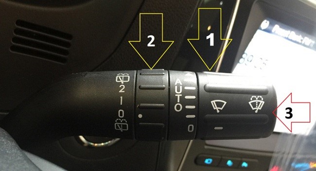 - Ấn nút trên đỉnh cần gạt mưa theo mũi tên số 3 để bơm nước rửa kính