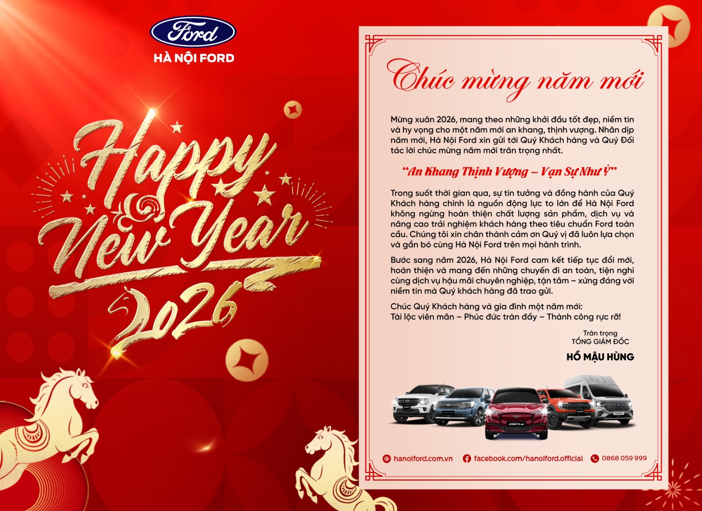 Mùa xuân 2026 đã về, mang theo những khởi đầu mới, niềm tin và hy vọng cho một năm an khang – thịnh vượng – thành công bền vững. Nhân dịp năm mới, Hà Nội Ford trân trọng gửi tới Quý Khách hàng và Quý Đối tác lời chúc mừng năm mới 2026 chân thành và tốt đẹp nhất.